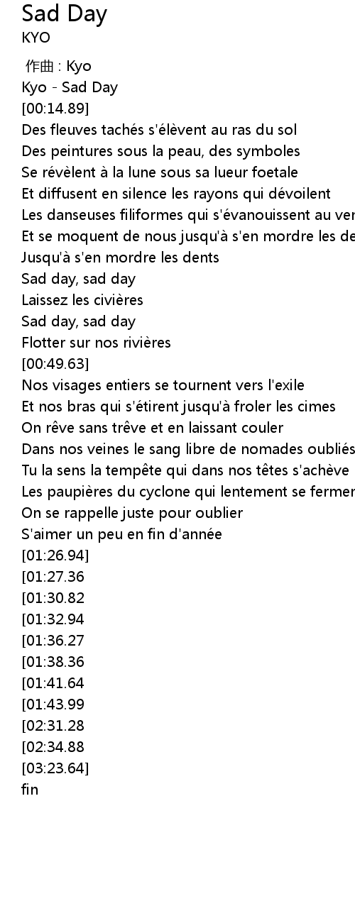 | [02:11.45][01:27.36] | Sad day, sad day |