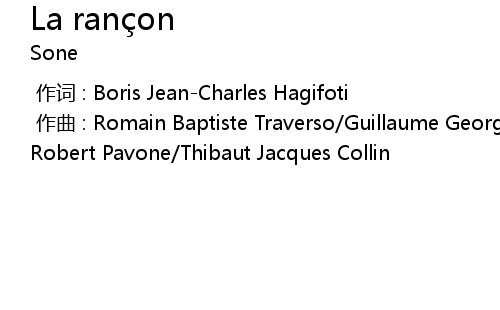 | [00:00.00-1] | 作曲 : Romain Baptiste Traverso/Guillaume Georges Levet/Franck Robert Pavone/Thibaut Jacques Collin |