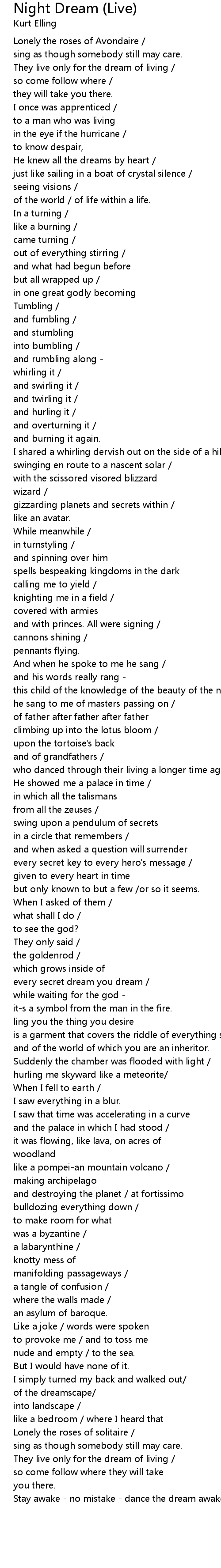 Stay awake - no mistake - dance the dream awake - and awake." |