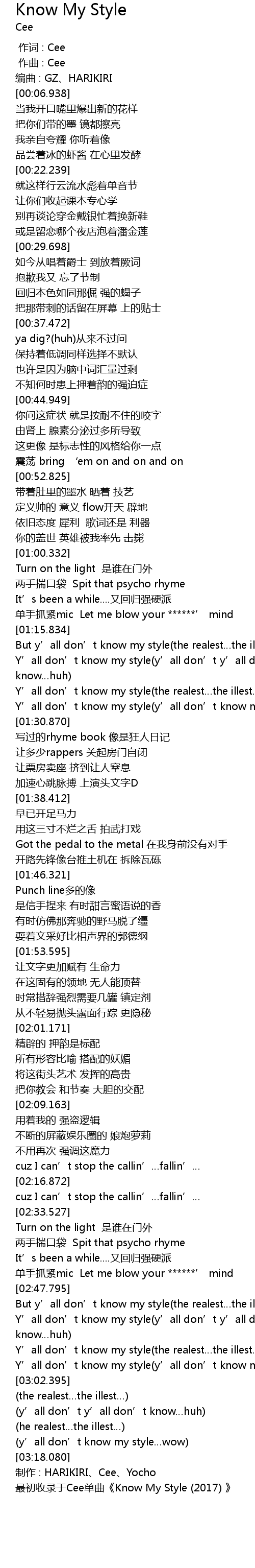 | [03:19.049] | 最初收录于Cee单曲《Know My Style (2017) 》 |