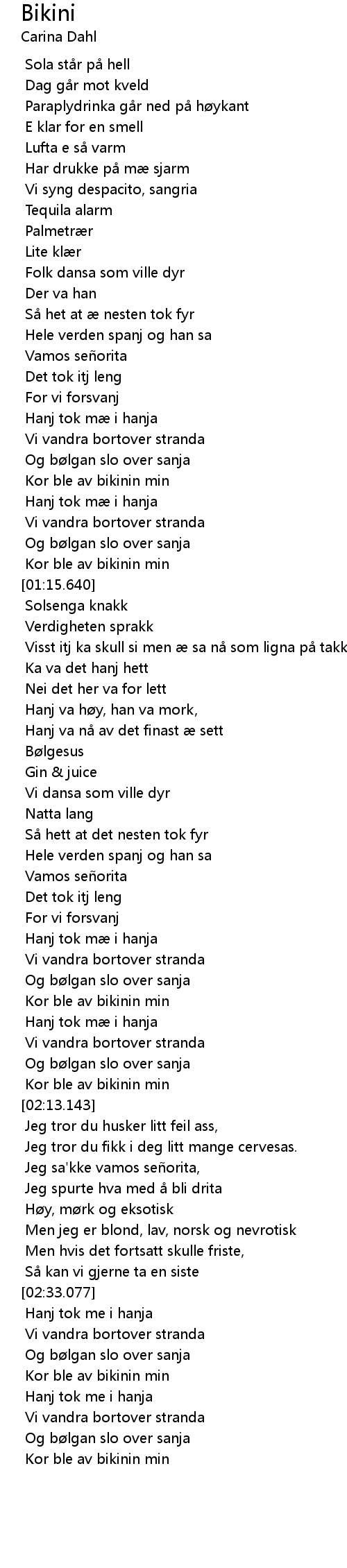 | [00:43.884] | Så het at æ nesten tok fyr |