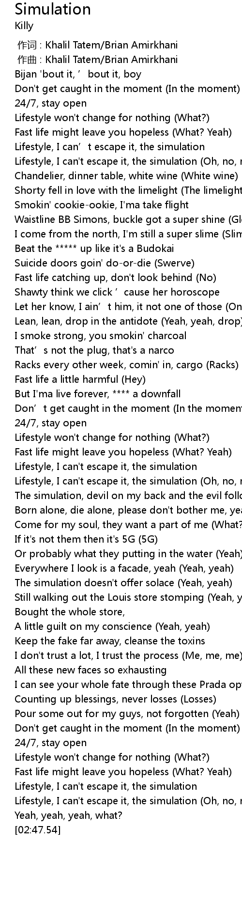 | [00:35.22] | Lifestyle, I can't escape it, the simulation (Oh, no, no) |