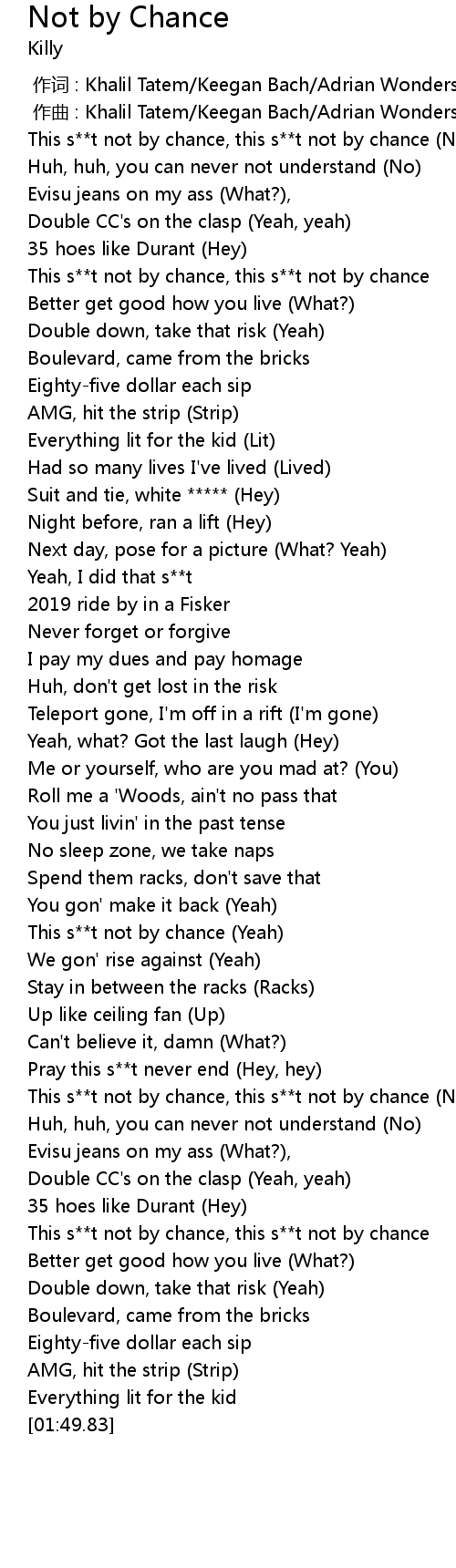 | [01:22.48] | This s**t not by chance, this s**t not by chance (Not by chance) |