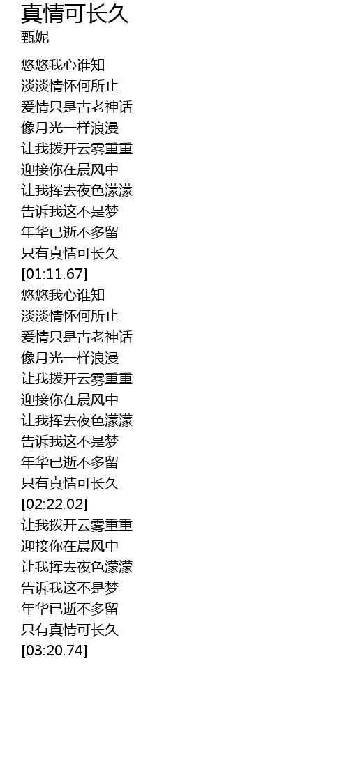 | [03:14.04] | zhǐ yǒu zhēn qíng kě cháng jiǔ |