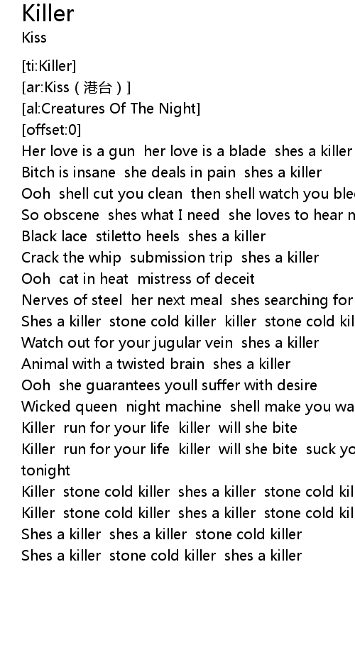 | [00:16.46] | Her love is a gun her love is a blade shes a killer |