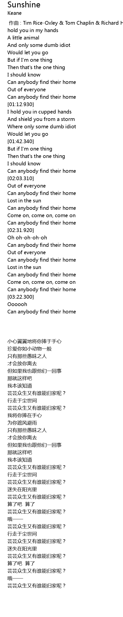 | [00:00.00] | zuò qǔ : Tim RiceOxley Tom Chaplin Richard Hughes James Sanger |