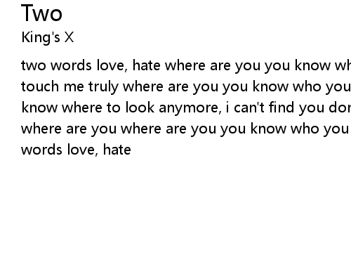 | two words love, hate where are you you know who you are two words love, hate touch me truly where are you you know who you are so i'm asking you so far don't know where to look anymore, i can't find you don't know where to look anymore, where are you where are you you know who you are so i'm asking you so far two words love, hate |