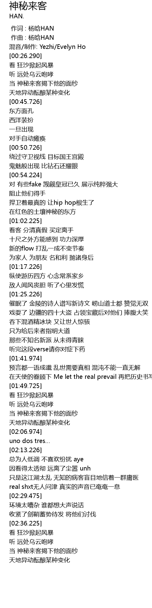 | [00:58.725] | 捍卫着最真的 让hip hop根生了 在红色的土壤神秘的东方 |