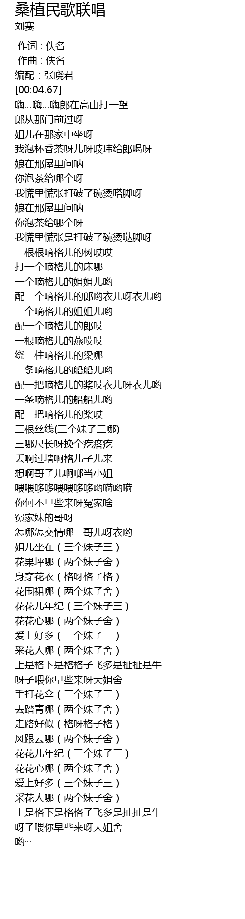 | [03:55.91] | 呀子喂你早些来呀大姐舍 |