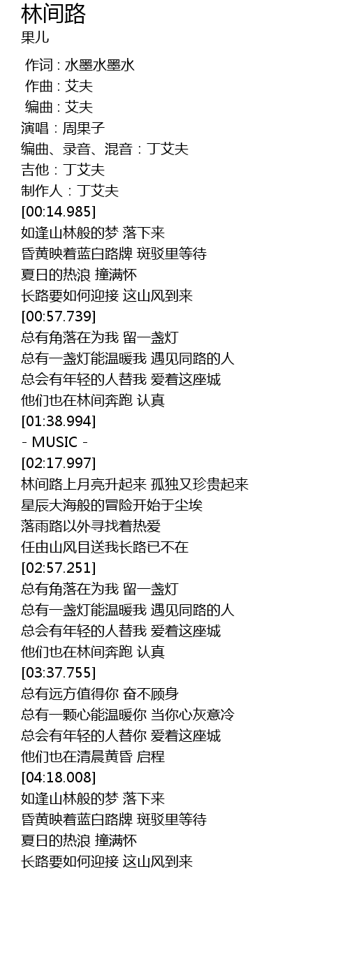 | [02:19.997] | 林间路上月亮升起来 孤独又珍贵起来 |
