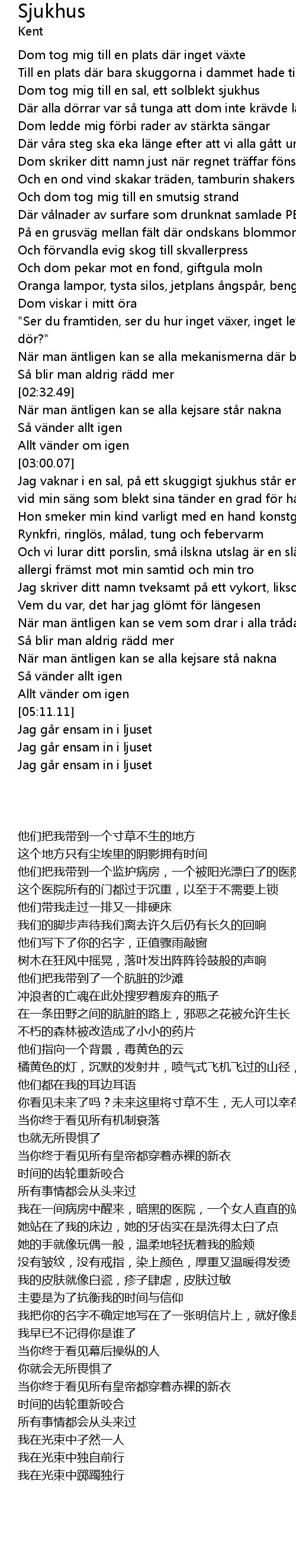 | [00:35.46] | Dom tog mig till en sal, ett solblekt sjukhus |