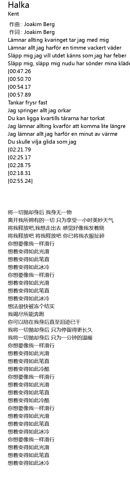 | [02:32.90][02:18.31][02:04.05] | Du skulle vilja glida som jag... |