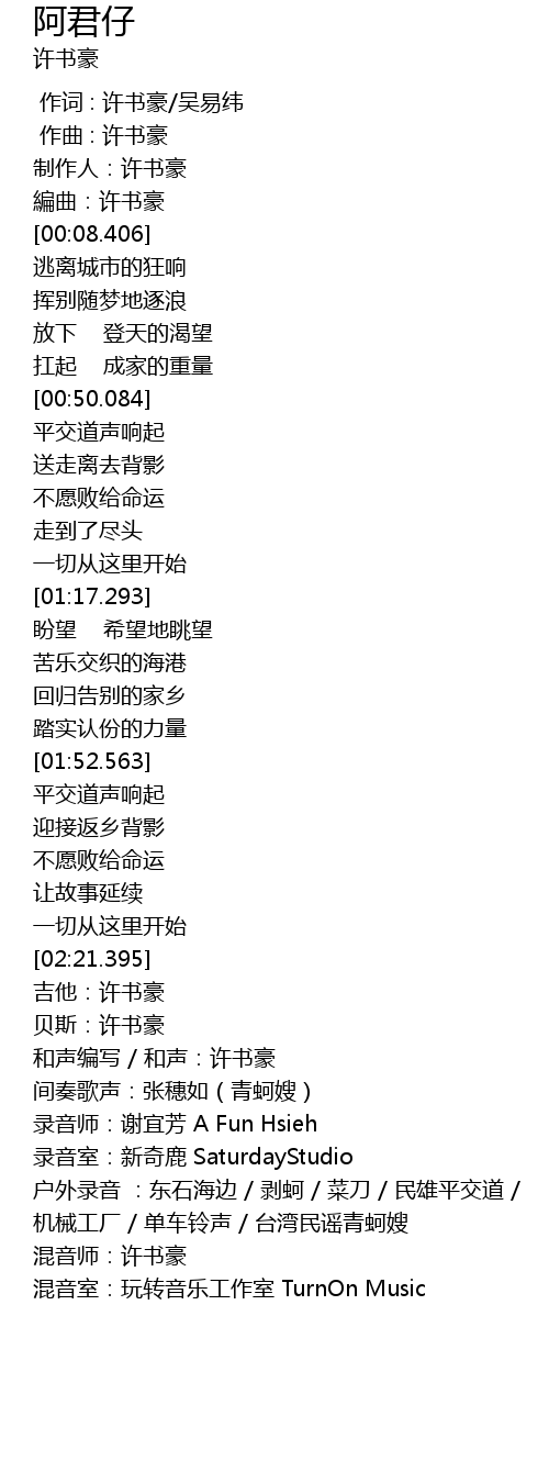 | [03:01.730] | 录音师:谢宜芳 A Fun Hsieh |