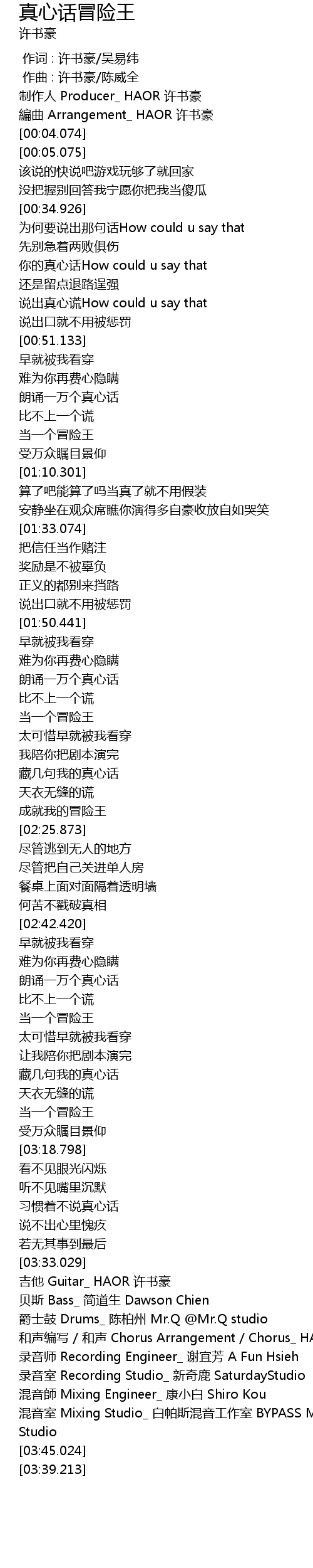 | [03:36.463] | 和声编写 / 和声 Chorus Arrangement / Chorus_ HAOR 许书豪 |