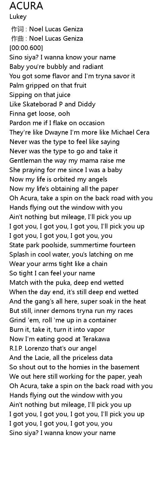 | [01:44.099] | Oh Acura, take a spin on the back road with you |
