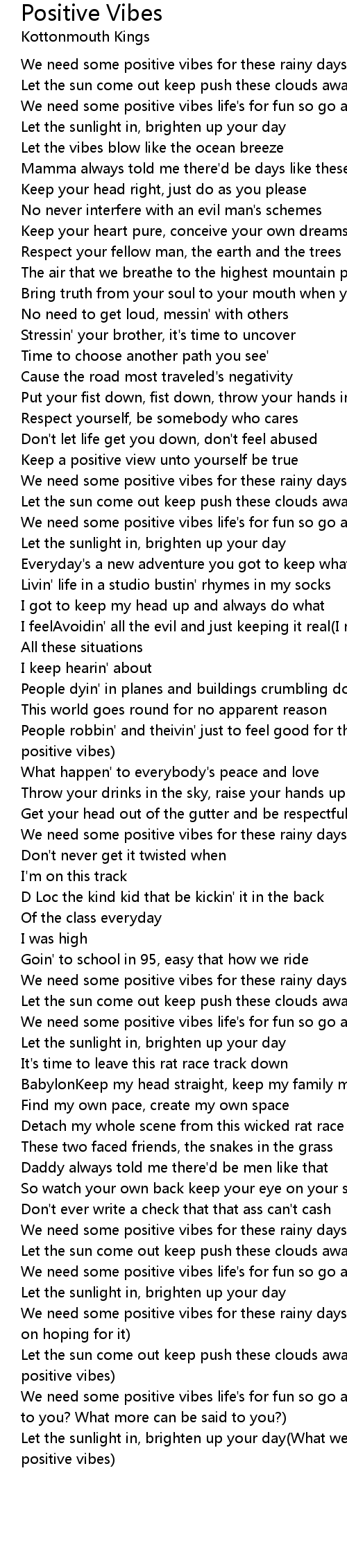 Let the sun come out keep push these clouds away(What we need is, all we have is positive vibes) |