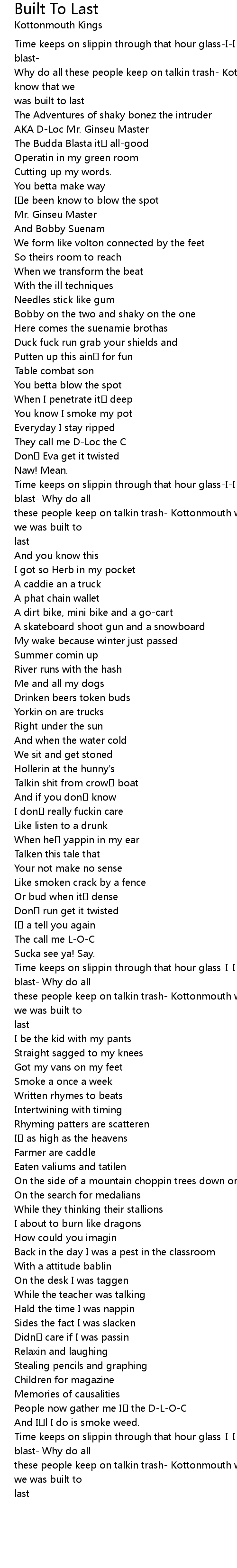 | Why do all these people keep on talkin trash Kottonmouth was built to last you know that we | |