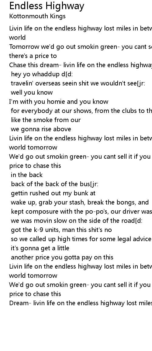 Dream- livin life on the endless highway lost miles in between[jr:] in the back of the back of the[d:] back of the back of the bus[jr:] on this never-ending journey, gettin searched by the fuzz[d:] gettin rushed out my bunk at nine-thirty in the mornin'[x:] wake up, grab your stash, break the bongs, and hide your doja[jr:] kept composure with the po-po's, our driver was on no-doze[jr:] we was movin slow on the side of the road[d:] and on the side of the road was more highway patrol's[d:] got the k-9 units, man this shit's no joke[jr:] so we called up high times for some legal advice[jr:] cause if we miss the show tonight, you know there's gonna be fights[d:] it's gonna get a little rowdy if the kings don't play[jr/x/d:] another price you gotta pay on this |