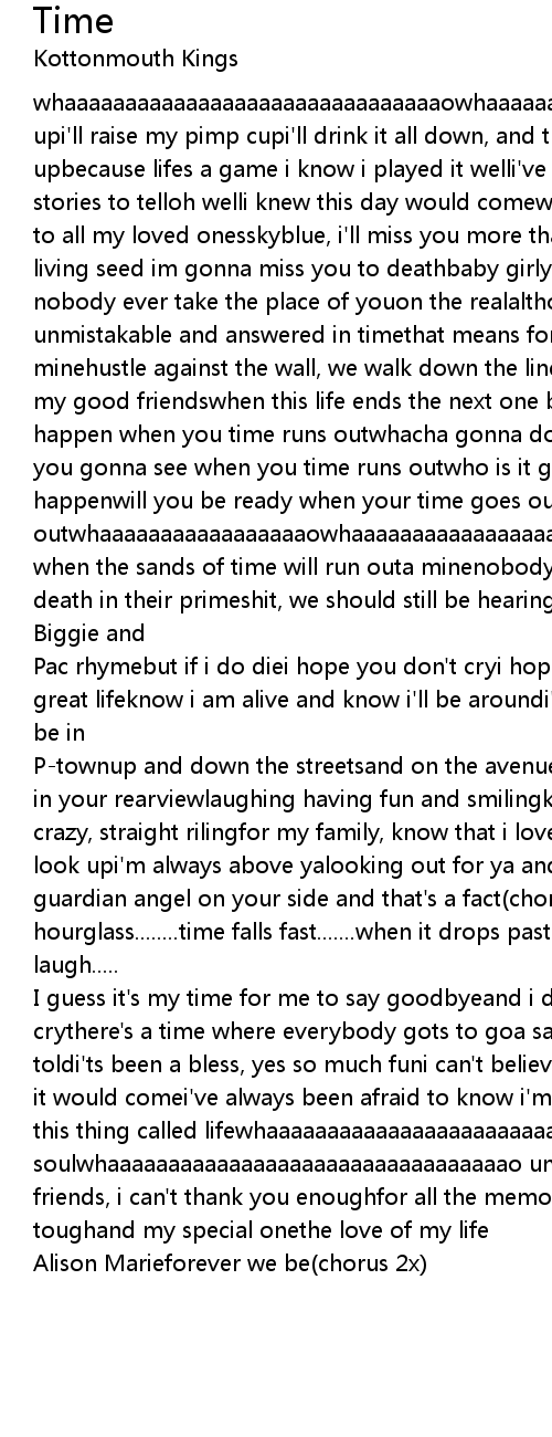 whaaaaaaaaaaaaaaaaaaaaaaaaaaaaaaaowhaaaaaaaaaaaaaaaaaaaaaaaaaaaaaaowhen my times upi'll raise my pimp cupi'll drink it all down, and then we'll blaze one upbecause lifes a game i know i played it welli've got a legacy of love and some stories to telloh welli knew this day would comewhen i would have to say goodbye to all my loved onesskyblue, i'll miss you more than all the restyou're my only living seed im gonna miss you to deathbaby girlyou the truest of the truecan't nobody ever take the place of youon the realalthough life's still unbreakableits unmistakable and answered in timethat means forever like their moms and minehustle against the wall, we walk down the linetell my family, fans, and all my good friendswhen this life ends the next one begins(chorus)what's gonna happen when you time runs outwhacha gonna do where are you gonna go nowwho are you gonna see when you time runs outwho is it gonna be and why is it gonna happenwill you be ready when your time goes outtime runs out, time runs outwhaaaaaaaaaaaaaaaaaowhaaaaaaaaaaaaaaaaaaaoyoi really dont like to thinkabout when the sands of time will run outa minenobody shouldn't be thinking about death in their primeshit, we should still be hearing |