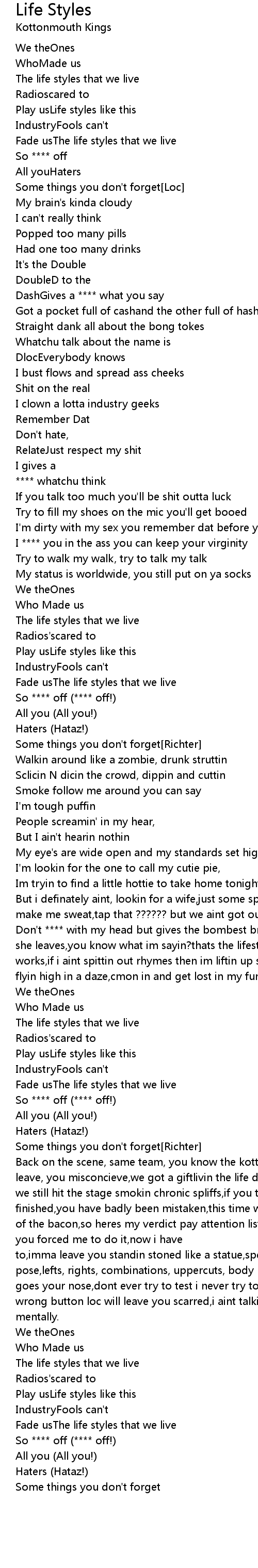 Back on the scene, same team, you know the kottonmouth kingsreign supreme us leave, you misconcieve,we got a giftlivin the life doin the things you wish,and we still hit the stage smokin chronic spliffs,if you thought we were finished,you have badly been mistaken,this time were takin overbringin home all of the bacon,so heres my verdict pay attention listen closely,theres no one in the world who can ****in out smoke me,[Loc]you forced me to do it,now i have to,imma leave you standin stoned like a statue,speechless, as i let loose a pose,lefts, rights, combinations, uppercuts, body blows,body blow, elbow there goes your nose,dont ever try to test i never try to rap hardbut if you push a wrong button loc will leave you scarred,i aint talkin physically im penetratin mentally. |