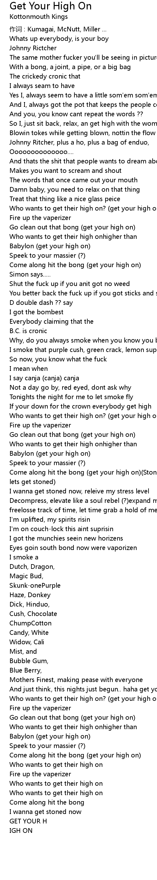 | Come along hit the bong (get your high on)(Stoned, lets get stoned) (Stoned, lets get stoned) | |