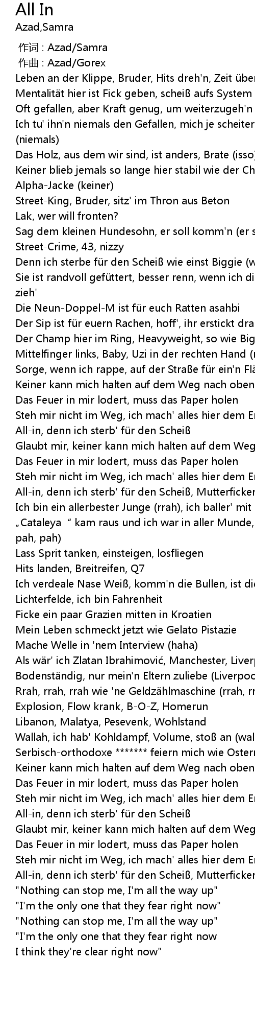 | [01:13.58] | All-in, denn ich sterb' für den Scheiß, Mutterficker, ist so (rrah!) |