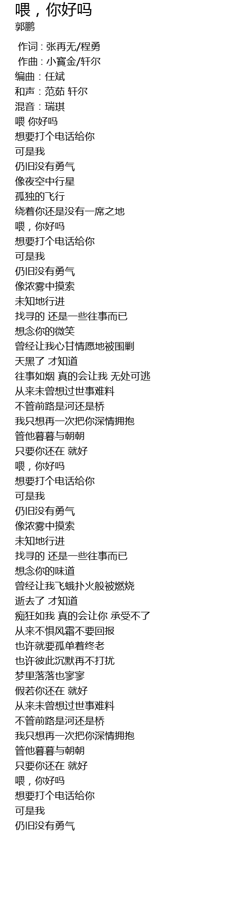 | [02:41.689] | wèi, nǐ hǎo ma |