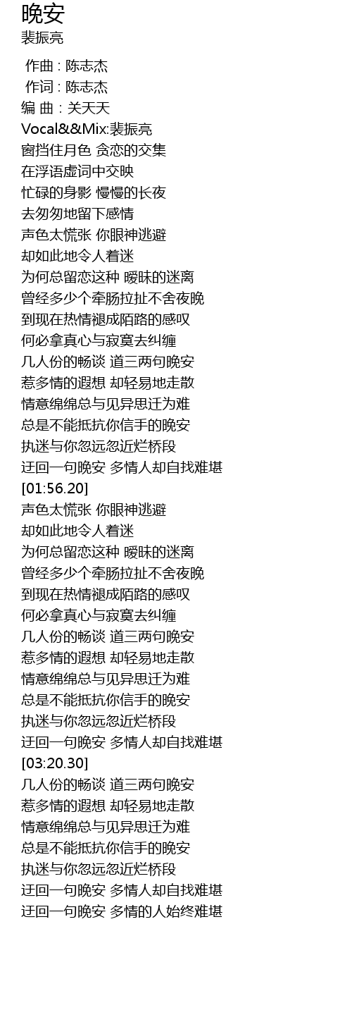 | [00:17.32] | Vocal&&Mix:裴振亮 |