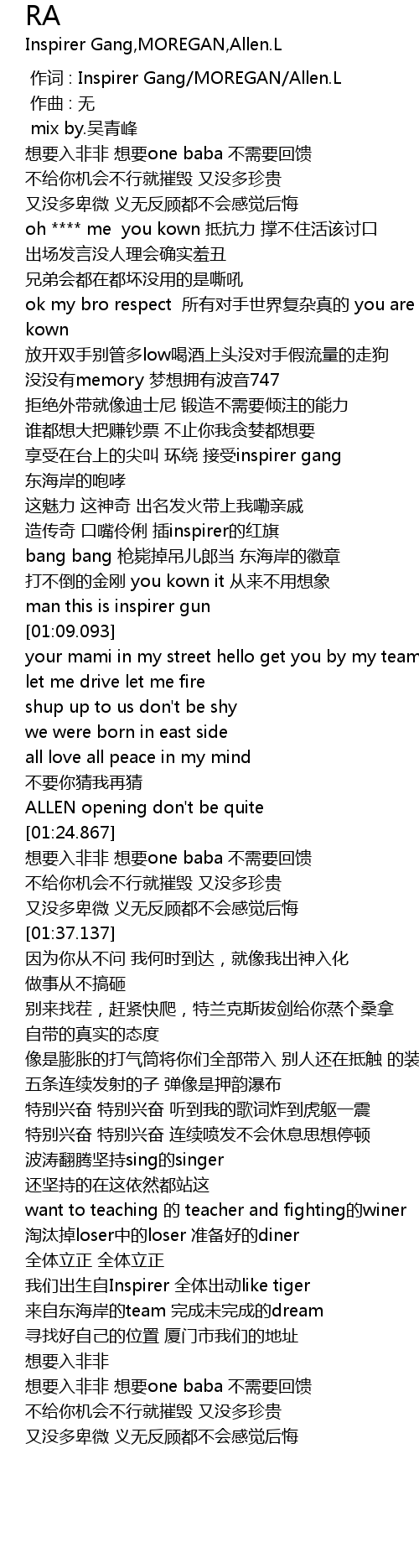 | [00:00.000] | zuò cí : Inspirer Gang MOREGAN Allen. L |