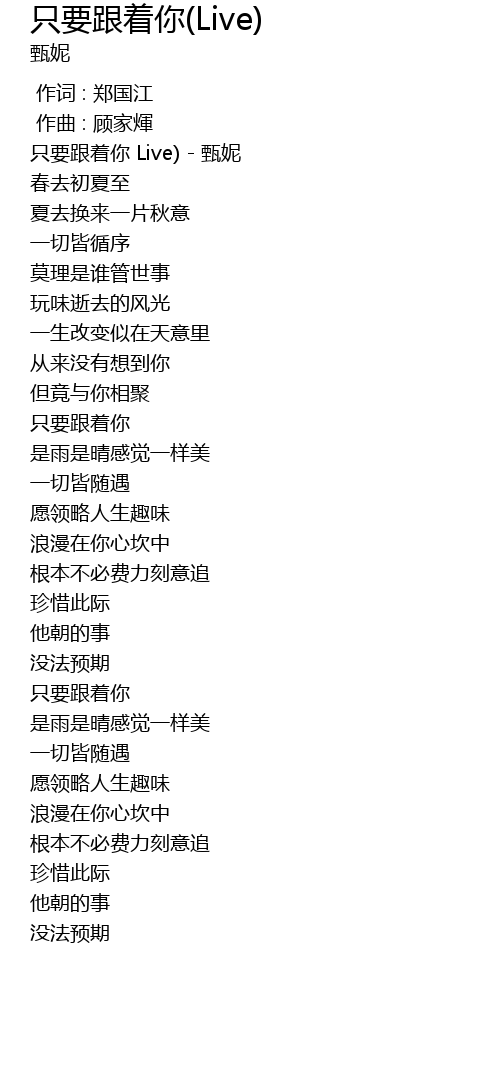 | [00:00.11] | 只要跟着你 Live) - 甄妮 |