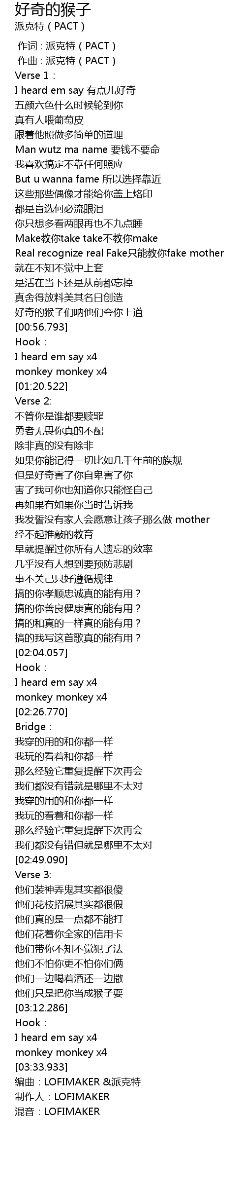 | [00:53.707] | 好奇的猴子们呐他们夸你上道 |