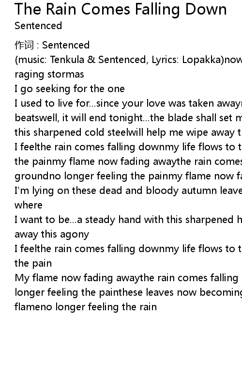 | I feelthe rain comes falling downmy life flows to the groundno longer feeling the painmy flame now fading awaythe rain comes falling downmy life flows to the groundno longer feeling the painmy flame now fading awayso here | |