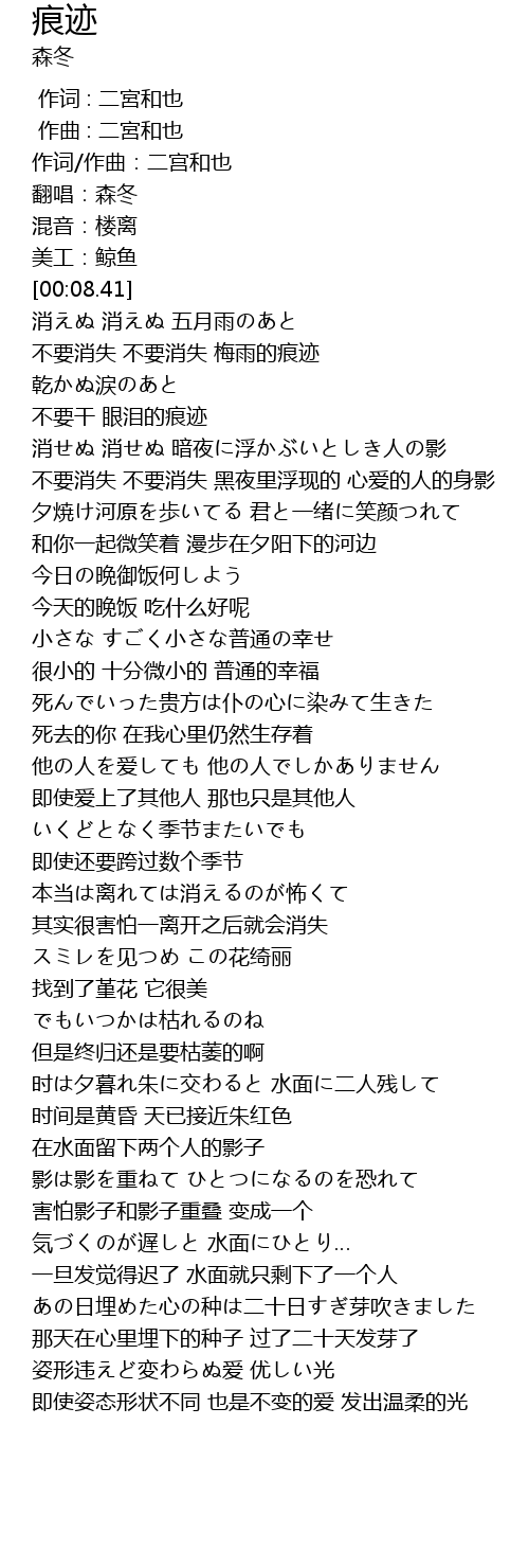 | [00:14.54] | 不要消失 不要消失 梅雨的痕迹 |