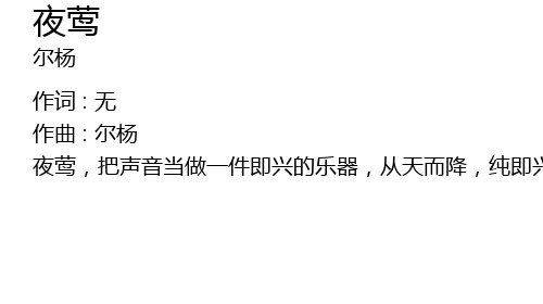 | 夜莺,把声音当做一件即兴的乐器,从天而降,纯即兴人声(生),外星语言。作词作曲都是上天,我只是想物归原主。 |