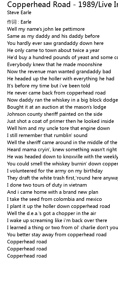 | You could smell the whiskey burnin' down copperhead road | |