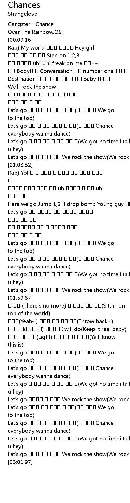 | [02:46.11] | Let's go 지금 내 앞에 기회가 온 거야(단 한번의 Chance everybody wanna dance) |