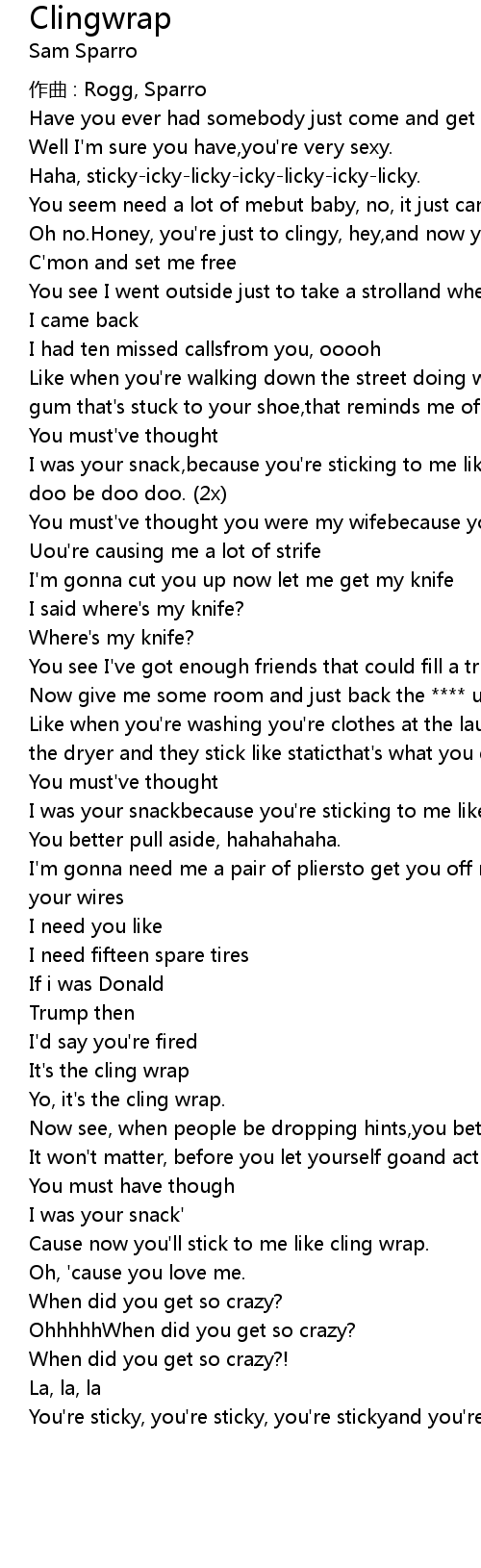 | You're sticky, you're sticky, you're stickyand you're like cling wrap (4x) |