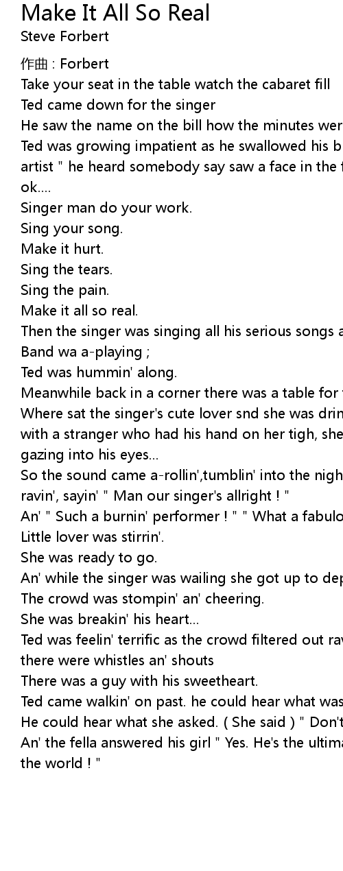 | Where sat the singer' s cute lover snd she was drinkin' a few, all snuggled up with a stranger who had his hand on her tigh, she was receivin' his message an' gazing into his eyes... | |