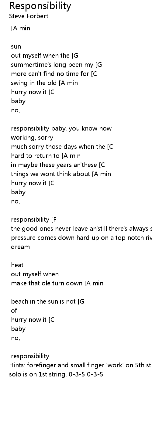 I've got so much [A min] responsibility [F] competition's heavy on a hard line wreckin'crew [A min] the good ones never leave an'still there's always some one new [F] pressure comes down hard up on a top notch rivet team [G] we don't get time to pace ourselves, we don't stand around and [A min] dream