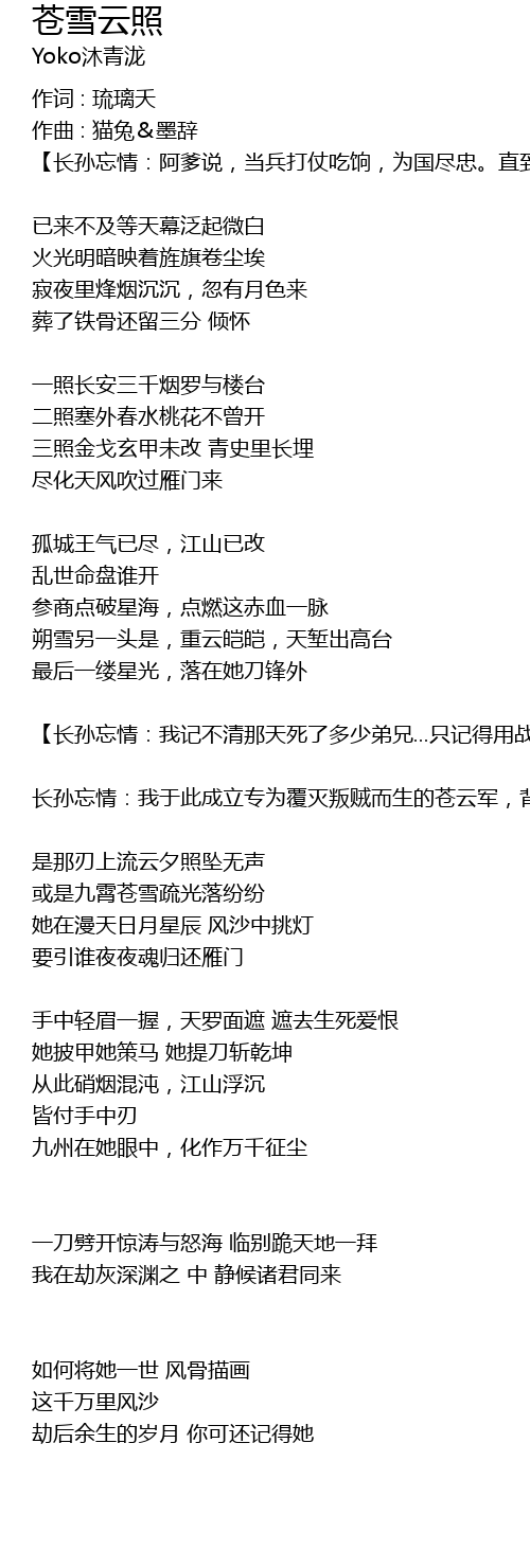 | 长孙忘情:我于此成立专为覆灭叛贼而生的苍云军,背叛苍云者不义之徒皆须一死!而我的轻眉刀,仍指在众军之前。你们,愿意,陪我一起去生,去死,去拿回应归于我们的战士荣光么?】 | |