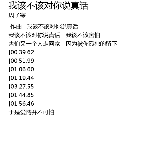 | [00:13.71] | 我该不该对你说真话 我该不该害怕 |