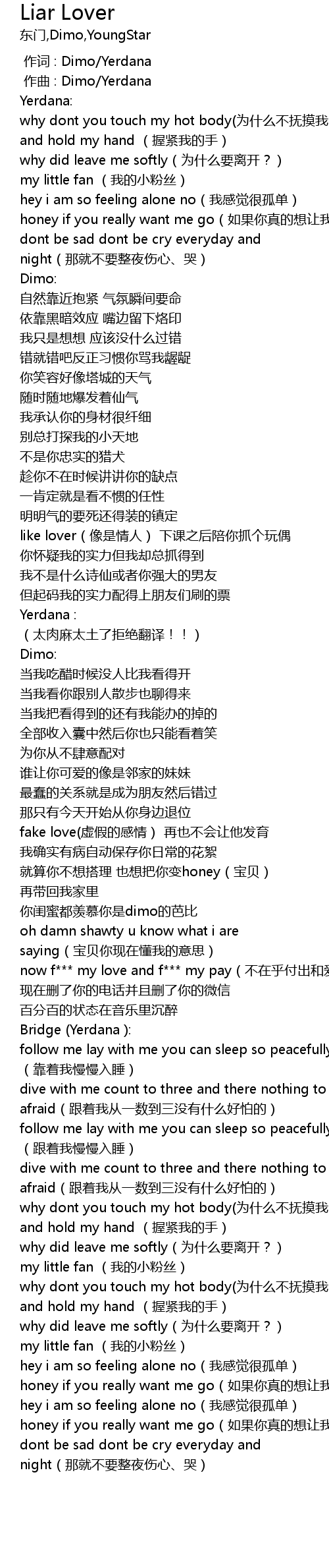 | [02:58.528] | why dont you touch my hot body wèi shí me bù fǔ mō wǒ de shēn tǐ? |