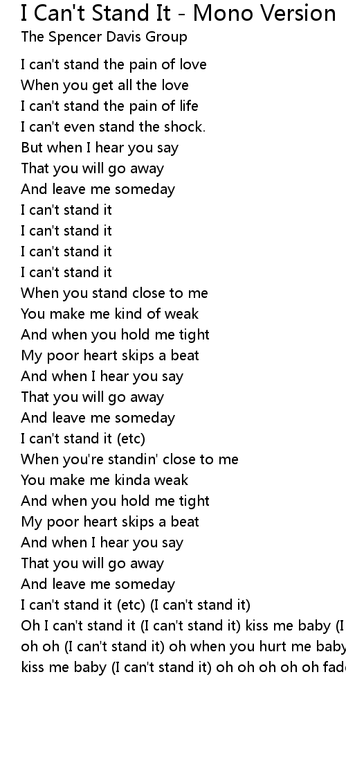 Oh I can't stand it (I can't stand it) kiss me baby (I can't stand it) oh oh oh oh oh (I can't stand it) oh when you hurt me baby (I can't stand it) oh when you kiss me baby (I can't stand it) oh oh oh oh oh fade |