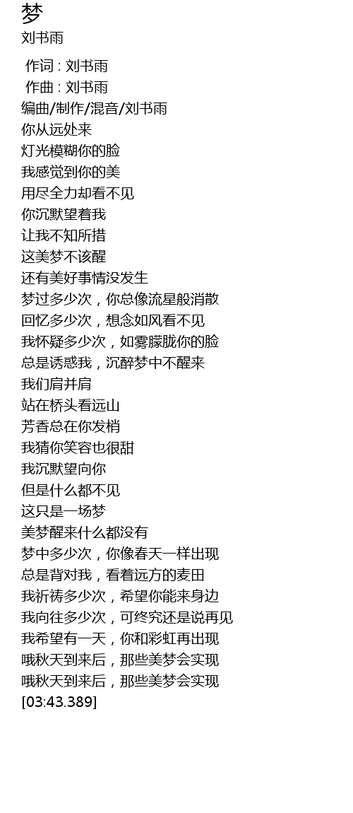 | [00:01.203] | 编曲/制作/混音/刘书雨 |