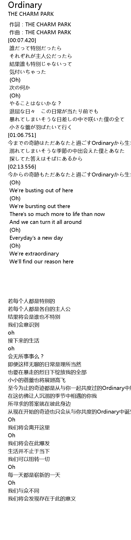 | [02:13.556] | 今からの奇跡もただあなたと過ごすOrdinaryから生まれてくるから |