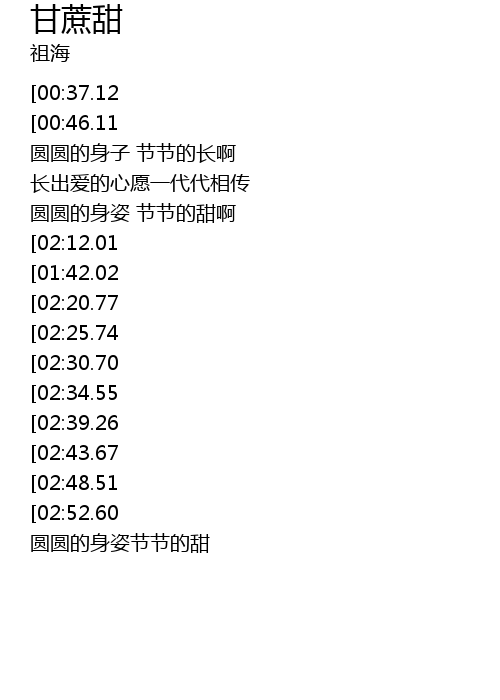 | [01:03.26][02:20.77][03:00.00] | 甘蔗香 甘蔗甜 |