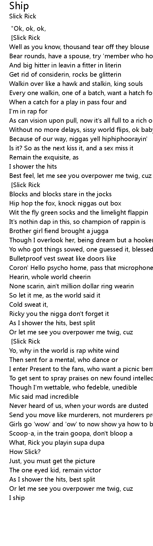 "Yes, yes the original" "Ricky, you the nigga don't forget it" [x6] "Ok, ok, ok, ok" [x6] [Slick Rick] |