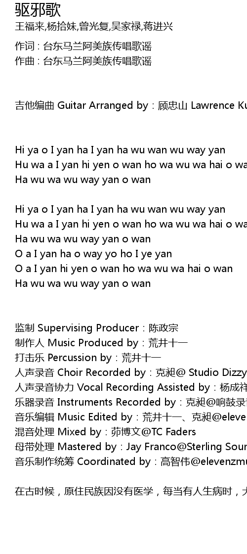 | 作词 : 台东马兰阿美族传唱歌谣 | |