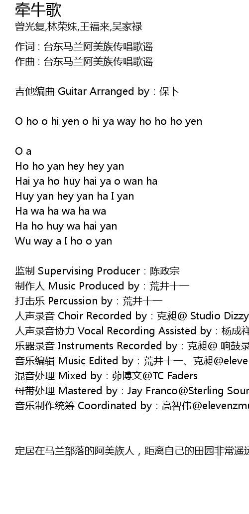 | 作词 : 台东马兰阿美族传唱歌谣 | |