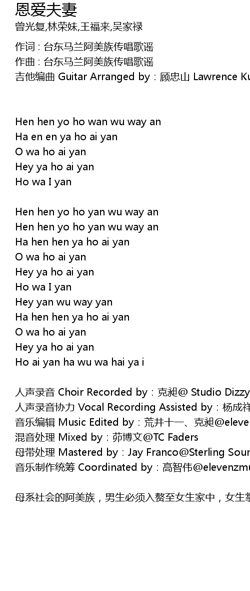 | 母系社会的阿美族,男生必须入赘至女生家中,女生掌管家中所有大大小小的事务,为了感念丈夫无怨无悔的付出,而唱起这首歌来悼念并感谢已逝的爱人。恩爱夫妻歌的意思:我的先生离开人世了,感谢他为这个家付出的一切,我很想念你,我很非常的思念你! |